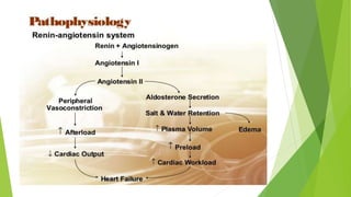 Congestive heart failure (CHF) is a chronic condition characterized by the inefficient pumping of the heart due to fluid buildup. In India, its prevalence due to risk factors like coronary heart disease and obesity is estimated between 1.3 to 4.6 million, with symptoms that include shortness of breath, chest pain, and fatigue. Management involves lifestyle modifications, medications like nitrates and beta-blockers, and possible surgical interventions.