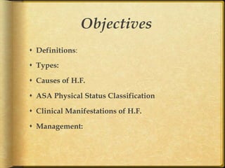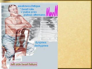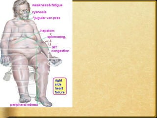 This document discusses heart failure, including its definitions, types, causes, clinical manifestations, and management from a dental perspective. It defines heart failure as the heart's inability to supply sufficient oxygenated blood to the body's needs. The types include left ventricle, right ventricle, and combined failure. Causes include congenital heart defects and conditions like cardiomyopathy. Clinical manifestations vary depending on which ventricle is affected but may include edema, dyspnea, fatigue, and cyanosis. Dental management involves recognizing signs of failure, terminating procedures if needed, positioning the patient comfortably, and providing post-procedure care and follow-up.