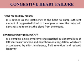 Congestive heart failure is a complex clinical syndrome characterized by abnormalities of left ventricular function and neurohormonal regulation. It occurs when the heart cannot pump enough blood to meet the body's needs. The pathophysiology involves compensatory mechanisms like increased sympathetic discharge and activation of the renin-angiotensin-aldosterone system which initially help but eventually worsen the heart's function. Congestive heart failure can be classified based on cardiac output level and the side of heart involved. Treatment focuses on relieving symptoms through diuretics, vasodilators, and other drugs while also arresting disease progression with ACE inhibitors, beta-blockers, and aldosterone antagonists.