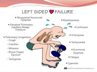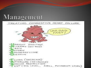 This document presents information on congestive heart failure. It begins with definitions of congestive heart failure and heart failure, noting that heart failure means the heart cannot pump enough blood to meet the body's needs. Statistics are provided on the incidence of congestive heart failure in the US, including that 800,000 patients are hospitalized annually and 250,000 die each year. The document discusses classifications, risk factors, signs and symptoms, diagnostic tests, pharmacological and surgical treatments, diet management, and nursing care for patients with congestive heart failure.