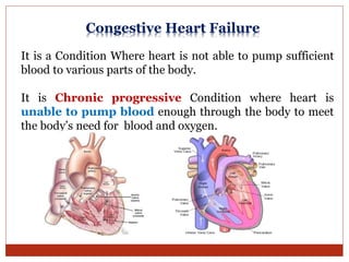 This document discusses congestive heart failure (CHF), which occurs when the heart cannot pump enough blood to meet the body's needs. It defines two types of CHF based on ejection fraction - systolic and diastolic dysfunction. Several causes of CHF are listed, including arrhythmias, myocardial infarction, hypertension, and obesity. The body compensates via the sympathetic nervous system and renin-angiotensin-aldosterone system. Drug classes used to treat CHF are discussed in detail, including cardiac glycosides like digoxin, beta blockers, ACE inhibitors, angiotensin receptor blockers, aldosterone antagonists, and vasodilators. Side effects of each class are
