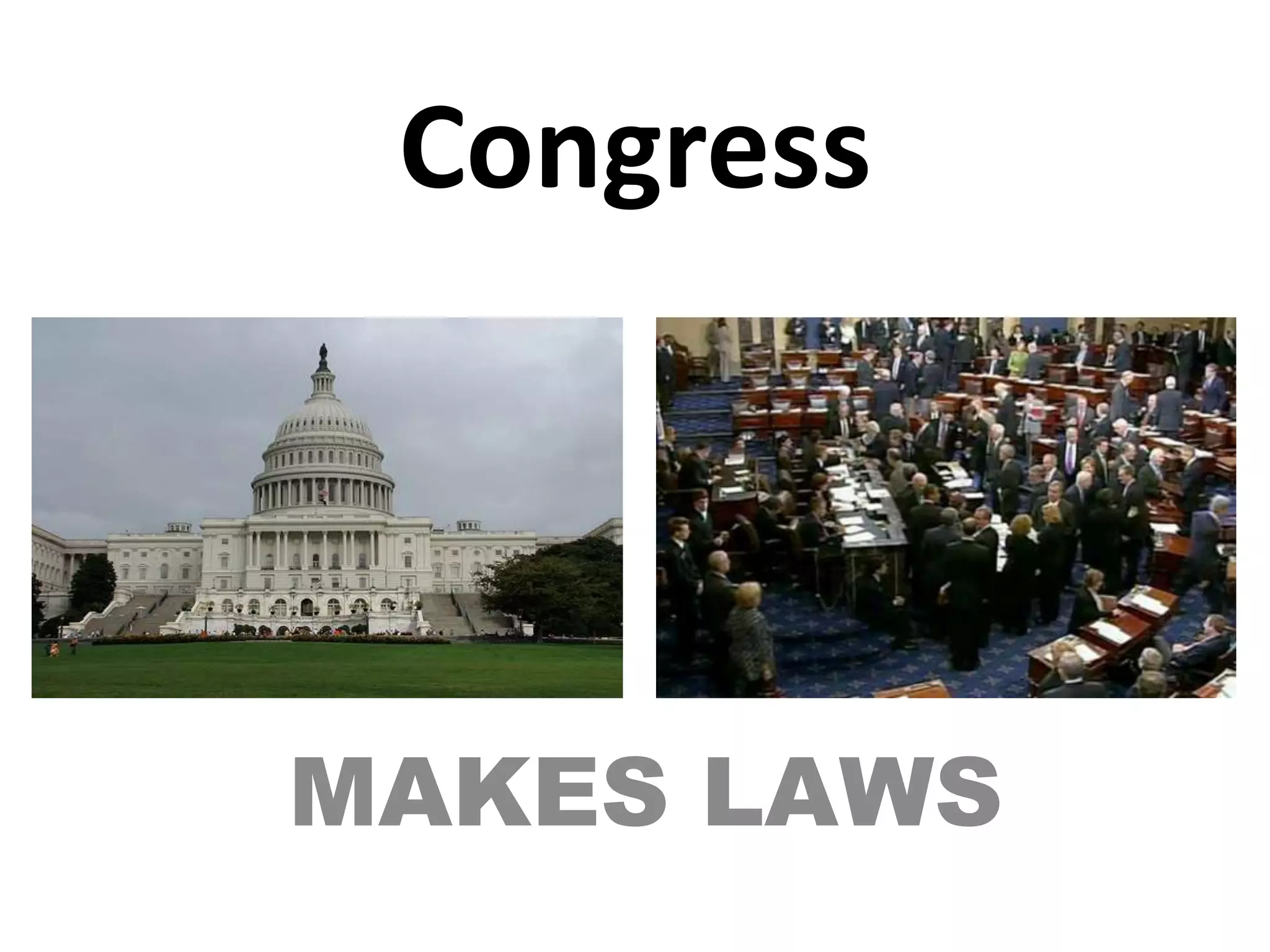 The document provides an overview of the structure and roles of the United States Congress, which is made up of the House of Representatives and Senate. It details the composition and leadership positions of both chambers, as well as the key duties of Congress which include passing laws, representing constituents, and overseeing the federal government. Procedures like redistricting, filibusters, and the committee process are also summarized.