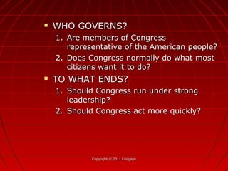 The document discusses various aspects of the U.S. Congress, including its composition, organization, and legislative process. It examines whether members of Congress represent the American people and explores debates around congressional leadership, partisanship, and effectiveness. The key topics covered are: 1) whether Congress is representative and responsive to citizens; 2) debates around congressional leadership and speed of action; 3) differences between Congress and parliaments in other countries; and 4) an example memorandum discussing arguments for and against doubling the size of the House of Representatives.