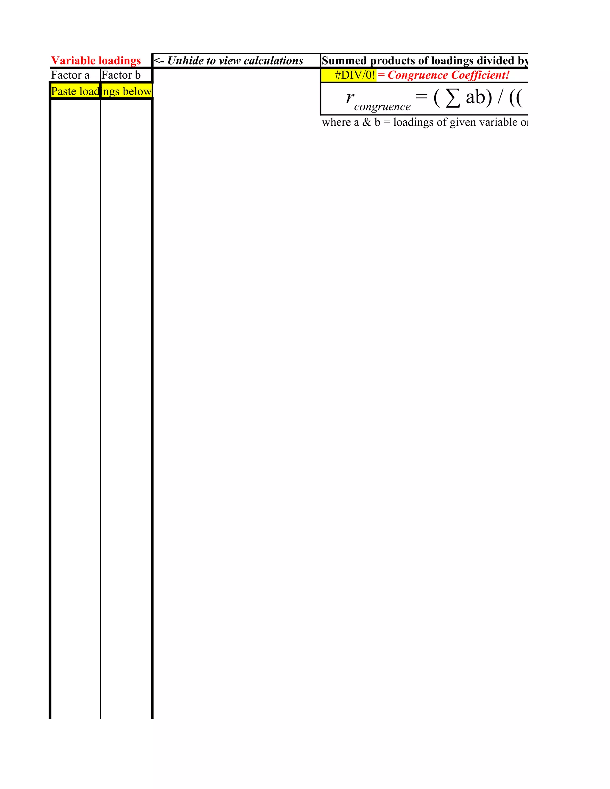 The document explains the calculation of the congruence coefficient using variable loadings for two factors, A and B. It involves summing the products of the loadings, dividing them by the square root of the products of the sums of squared loadings for each factor. For further questions, the document provides an email contact.