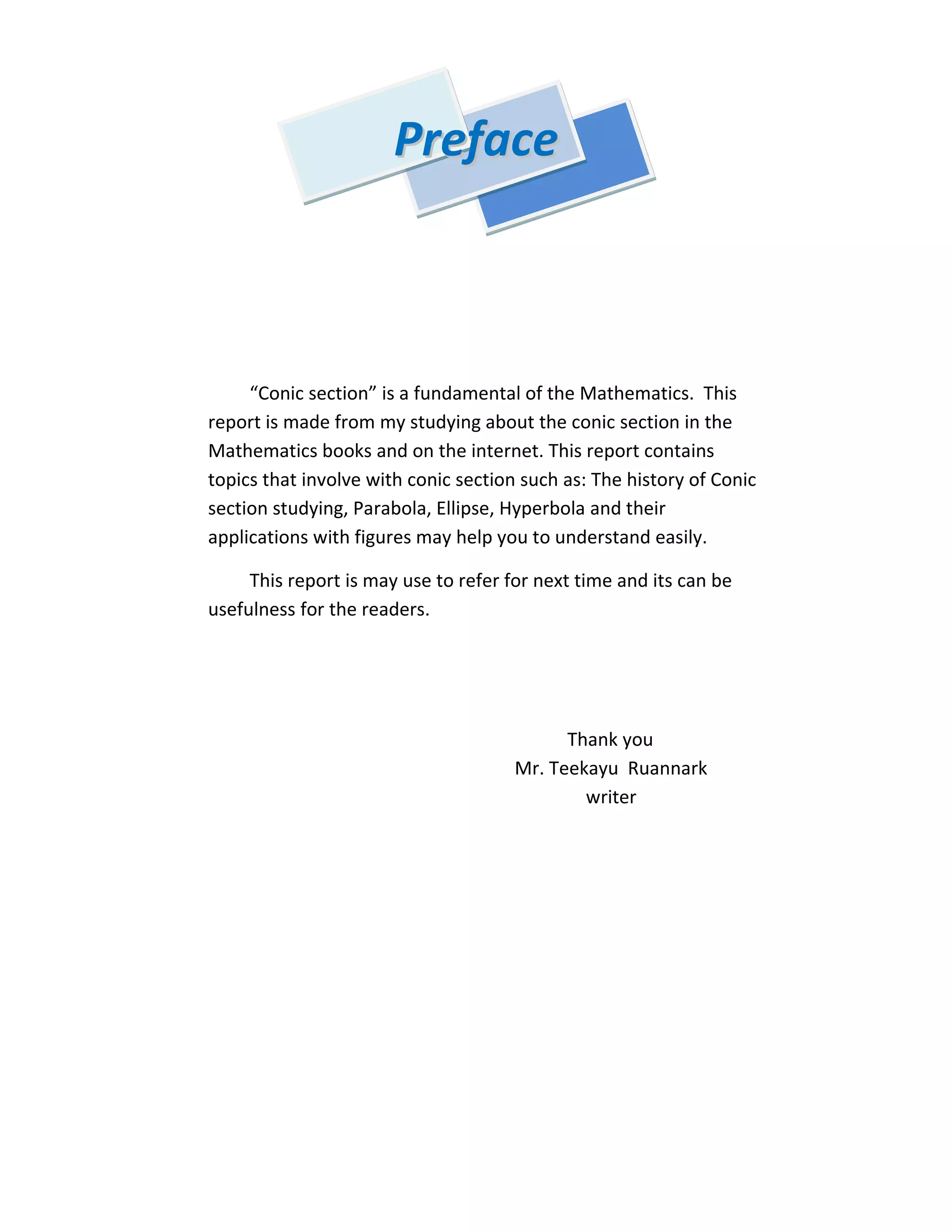 This document is a detailed mathematics report on conic sections, authored by Mr. Teekayu Ruannark and supervised by Mrs. Vannee Chatngern, as part of the M43102 course. It covers the historical development, definitions, equations, and applications of conic sections, including ellipses, parabolas, and hyperbolas, referencing significant mathematicians such as Apollonius of Perga and Johannes Kepler. The report serves as a comprehensive resource for understanding conic sections and their practical relevance in various fields.