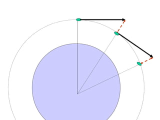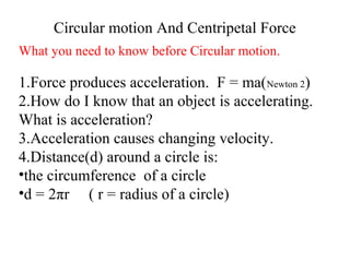 This document provides information on circular motion and centripetal force. It defines key terms like centripetal acceleration, centripetal force, and tangential velocity. Formulas are given for centripetal acceleration (a=v2/r), centripetal force (Fc=mv2/r), and tangential velocity (v=2πr/T). Examples of circular motion under combined forces are given, including the conical pendulum, banked curves, and airplanes banking in turns. Vertical circular motion examples like elevators and rollercoasters are also discussed. The document concludes with information on satellite motion and orbits.