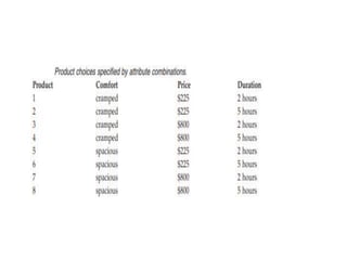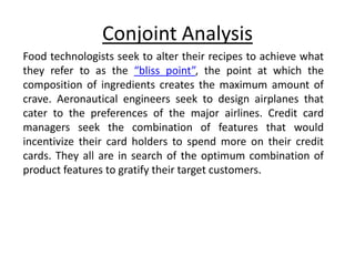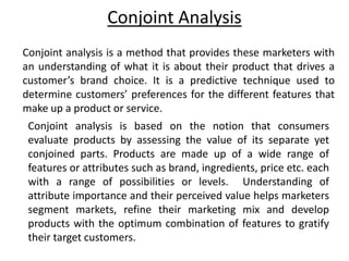 Conjoint analysis is a market research technique used to understand customers' preferences for different product features. It involves assessing customers' ratings, rankings, or choices between hypothetical products defined by various attribute levels to estimate the value or "part-worth" that customers place on each attribute level. This helps companies design products with optimal combinations of features to satisfy customers. The method originated in psychology in the 1970s and uses computer surveys to consider many attributes and levels simultaneously, simulating real purchase decisions involving trade-offs between features.