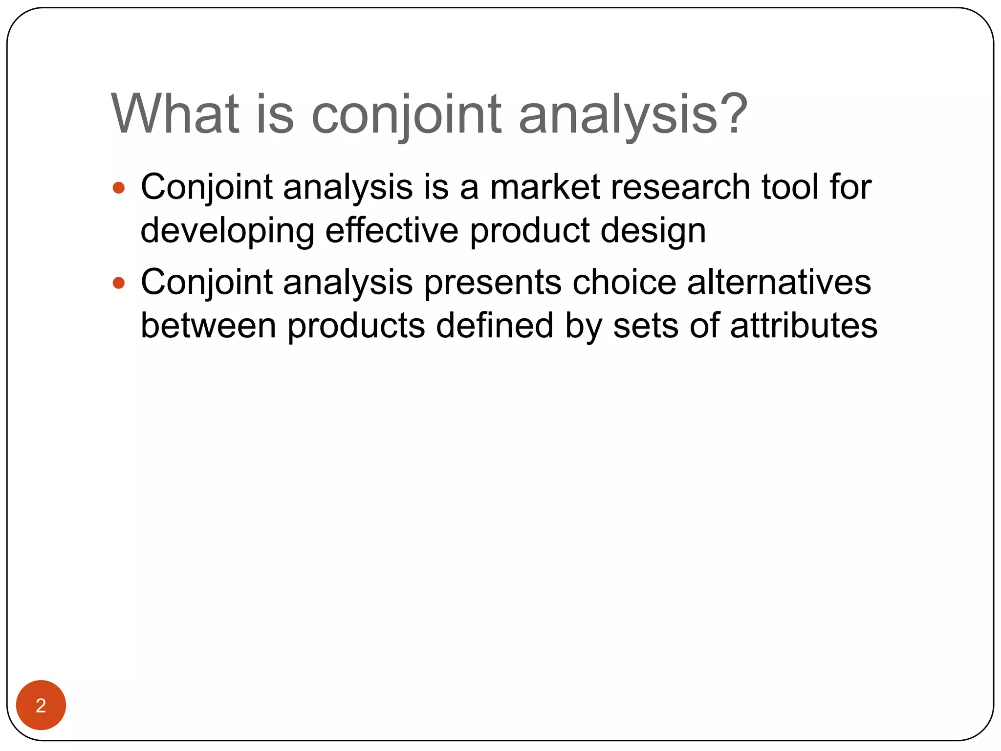 Conjoint analysis is a market research tool used to develop effective product designs. It identifies the key attributes that influence consumer decisions by presenting choices between products defined by attribute sets. Conjoint analysis uses multivariate analysis to understand consumer preferences for different attribute levels of a product. An example shows how conjoint analysis could be used to understand consumer preferences for different cleanliness, shine, smell, quantity, packaging, and design attributes of dishwashing products. Conjoint analysis is commonly used in marketing, product management, operations research, and other fields to test consumer acceptance of new products and advertisements.