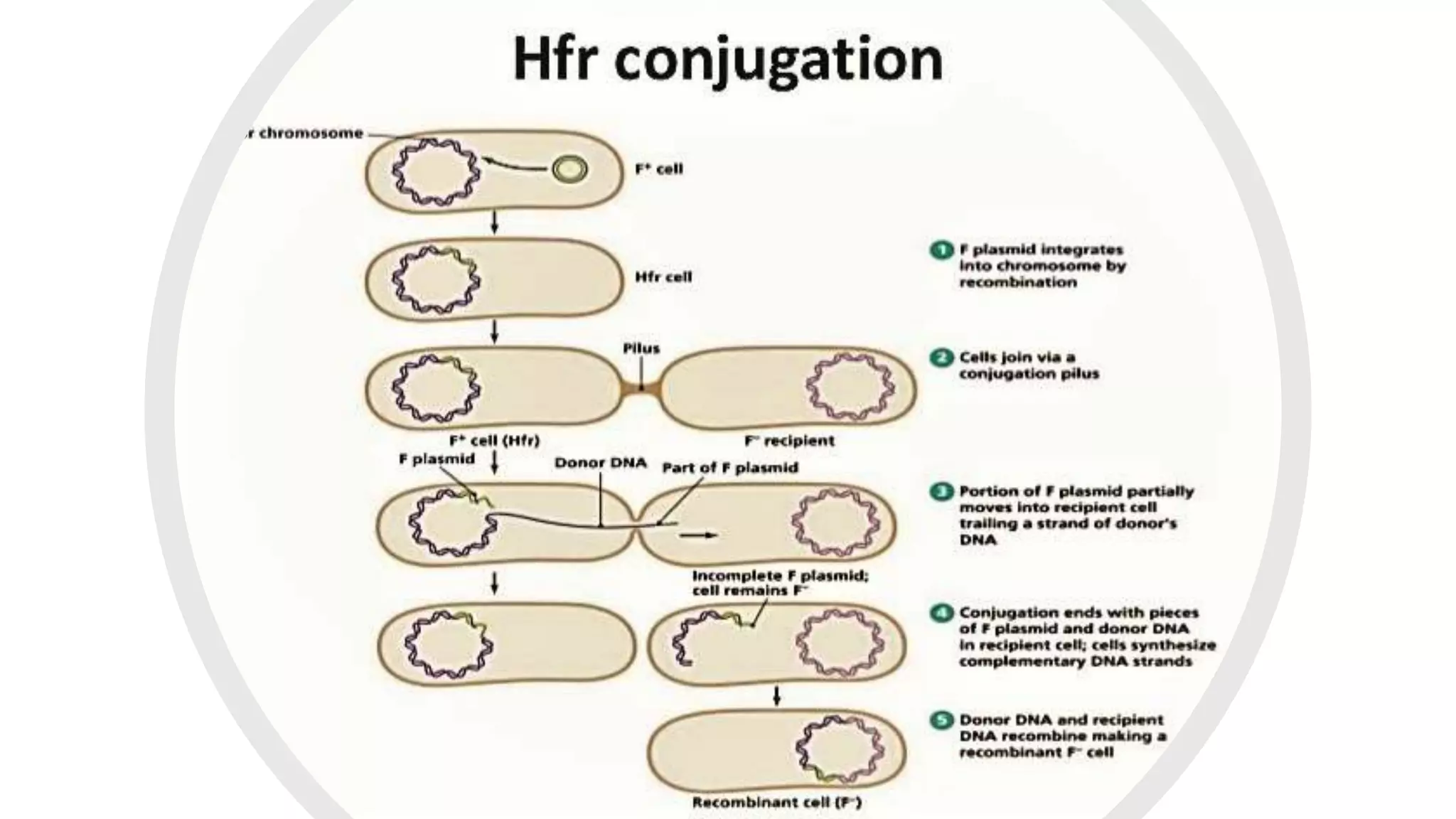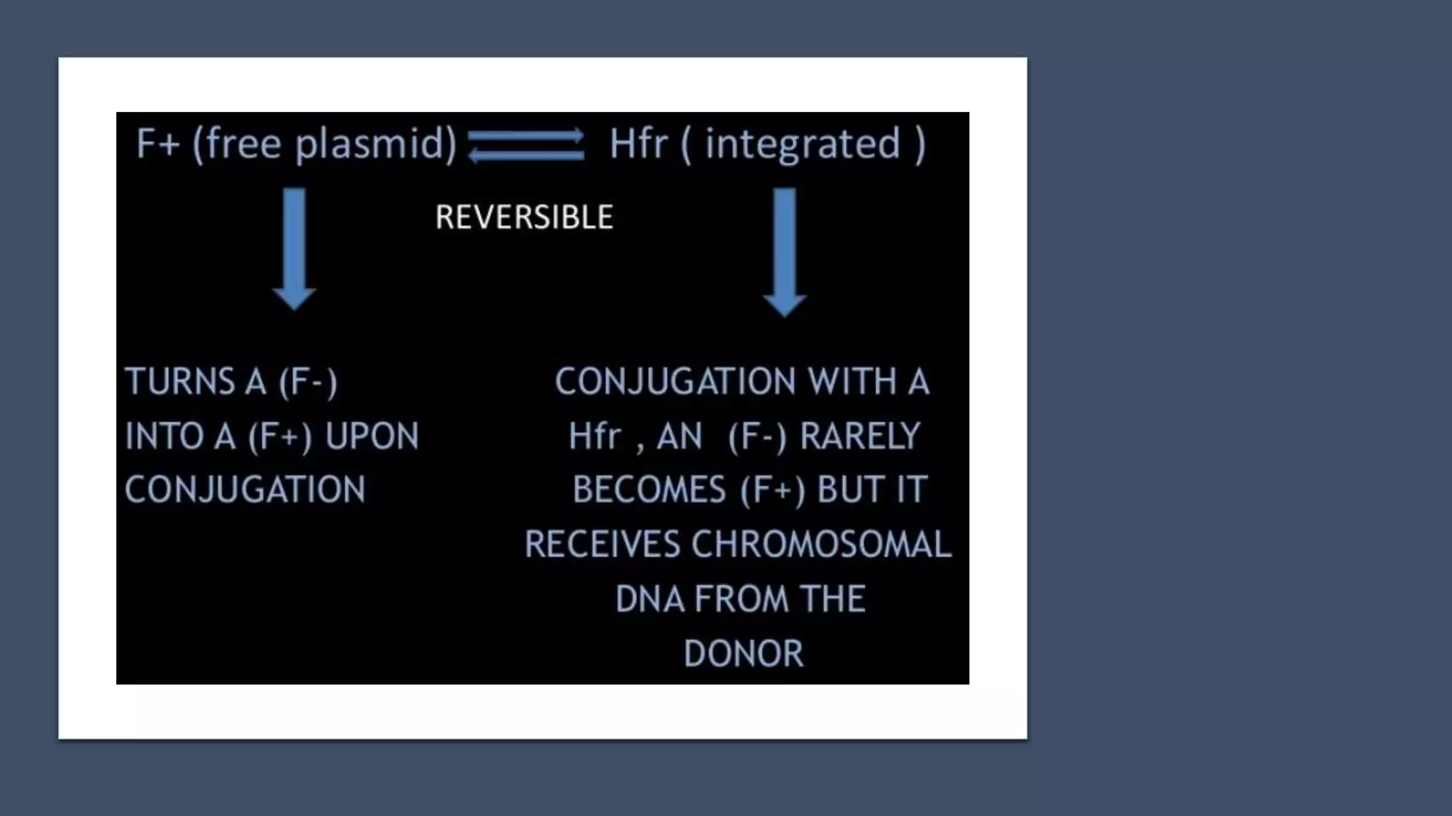 The document discusses conjugation in bacteria involving F plasmids and Hfr strains. It notes that the F plasmid is an episome that can integrate into bacterial chromosomes at homologous sequences, and when integrated it can direct pili formation and genetic transfer. During conjugation with an F- cell, the Hfr donor chromosome moves through the pilus, transferring genes sequentially until the connection breaks, leaving the recipient only partially transformed. Occasionally during F plasmid excision, it can pick up chromosomal genes to form an F' plasmid. Conjugation allows for horizontal gene transfer between bacteria, important in the spread of antibiotic resistance.