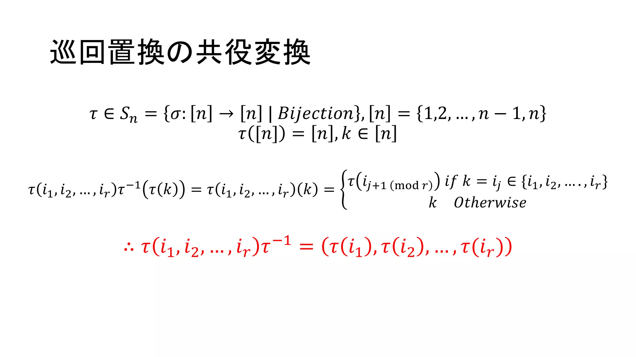 The document discusses conjugate cyclic permutations in group theory. It defines a cyclic permutation τ as a bijection from a set of numbers n to itself, where it maps n to n and a number k to the number following it. It then defines the conjugate of a cyclic permutation τ by another cyclic permutation τ-1 as mapping the elements i1, i2, ..., ir of τ to their images under τ-1 in the same order. So the conjugate of τ by τ-1 is obtained by applying τ-1 to each element of τ.