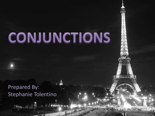 This document provides information about conjunctions including their definition and examples. Conjunctions are words that join together sentences, clauses, phrases, or words. Common conjunctions include "and", "but", "or", "so", and "yet". The document also contains practice questions about identifying conjunctions and the parts of sentences or phrases they connect.