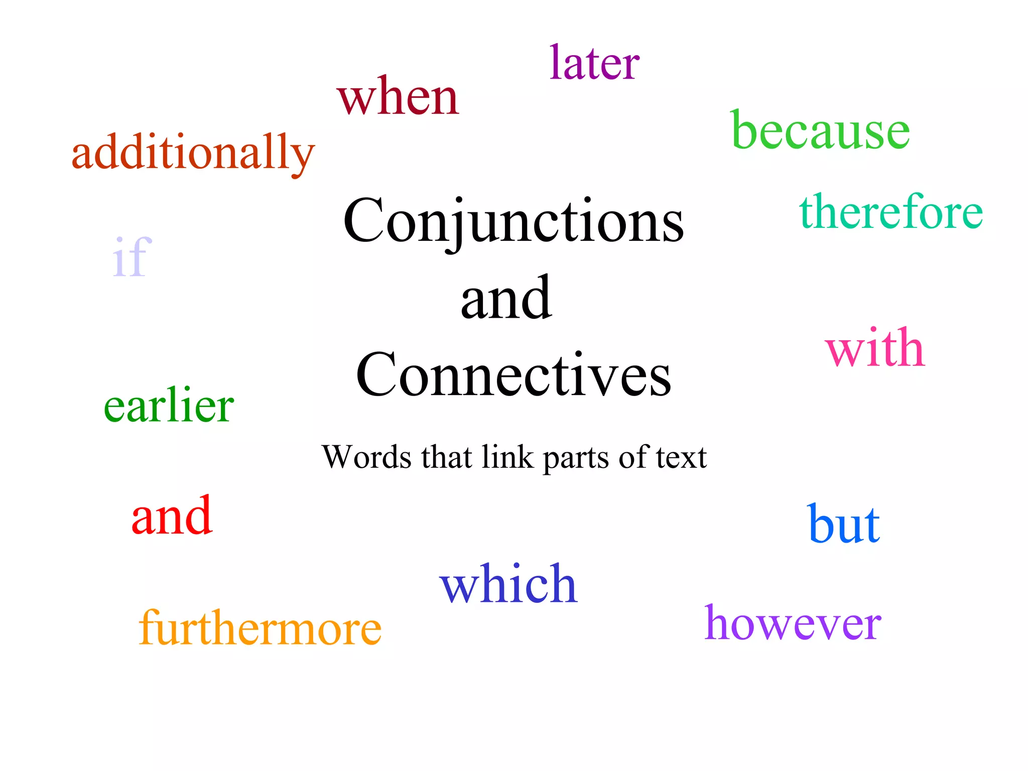 The document discusses conjunctions and connectives such as and, but, because, when, which, with, and if. It provides examples of how conjunctions can be used to join sentences or clauses together, such as in sentences about Susie seeing a dog with three legs and Sarah running away from a barking dog. Conjunctions link parts of text in a variety of ways.