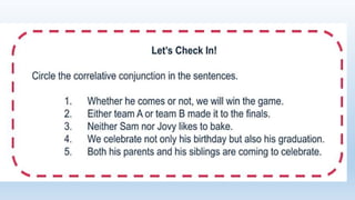 This document discusses different types of conjunctions used to connect words, phrases, and clauses in sentences. It defines coordinating conjunctions as words like "and", "but", and "or" that connect equal elements. Subordinating conjunctions introduce dependent clauses and include words like "after", "although", and "because". Correlative conjunctions always come in pairs to connect equal elements like "either...or" and "not only...but also". The document provides examples of each type of conjunction and exercises to help the reader identify them in sentences.