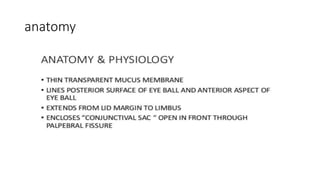 This document discusses various types of conjunctivitis including bacterial, chlamydial, viral, allergic, and cicatricial conjunctivitis. It provides details on trachoma, a chronic keratoconjunctivitis caused by Chlamydia trachomatis. Trachoma has active and cicatricial stages, with signs including follicles, papillae, pannus, scarring, and corneal sequelae. Laboratory diagnosis involves conjunctival cytology, detection of inclusion bodies, ELISA for chlamydial antigens, PCR, and culture. Trachoma is a major cause of preventable blindness worldwide.