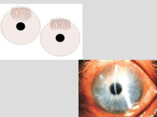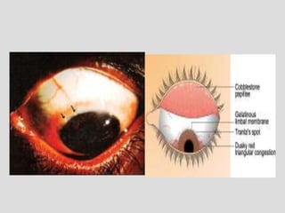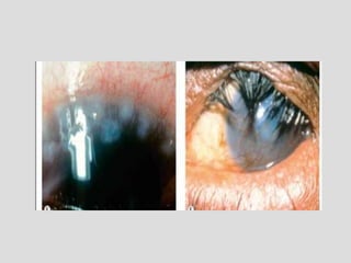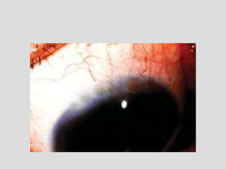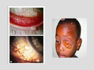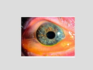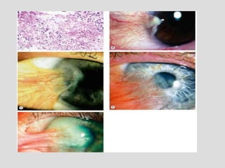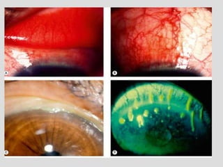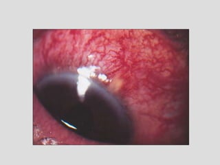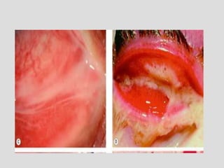 This document describes conjunctivitis, specifically inflammation of the conjunctiva. It discusses the clinical signs, classification, etiology, pathology, and types of bacterial conjunctivitis. The most common type is acute mucopurulent conjunctivitis, characterized by conjunctival hypermia and mucopurulent discharge. Other types discussed in detail include acute purulent conjunctivitis often caused by Neisseria gonorrhoeae, and acute membranous conjunctivitis caused by Corynebacterium diphtheriae forming a membrane on the conjunctiva. Treatment involves topical and systemic antibiotics depending on the specific type and causative organism.