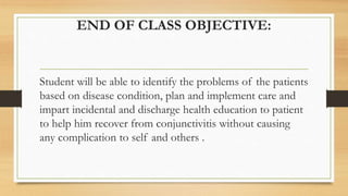 The document outlines conjunctivitis, its causes, types, and management strategies, focusing on patient care and education. It describes the anatomy and physiology of the conjunctiva, the clinical manifestations of conjunctivitis, and various treatment modalities based on the type of conjunctivitis. Patient education emphasizes hygiene practices to prevent spread and manage symptoms effectively.