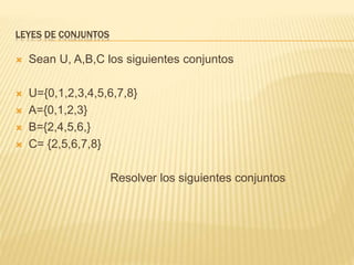 2) It then solves examples demonstrating set laws, such as idempotence, associativity, commutativity, distributivity, and identity.