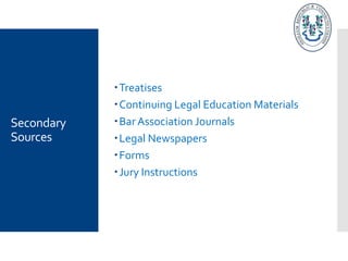This document summarizes the key secondary and primary sources for conducting legal research on Connecticut practice and law. It outlines the major treatises, continuing legal education materials, bar journals, newspapers, forms and jury instructions available as secondary sources. The primary sources covered are statutes, regulations, case law from various Connecticut courts, and court rules, with details on accessing each source through print and online legal databases.