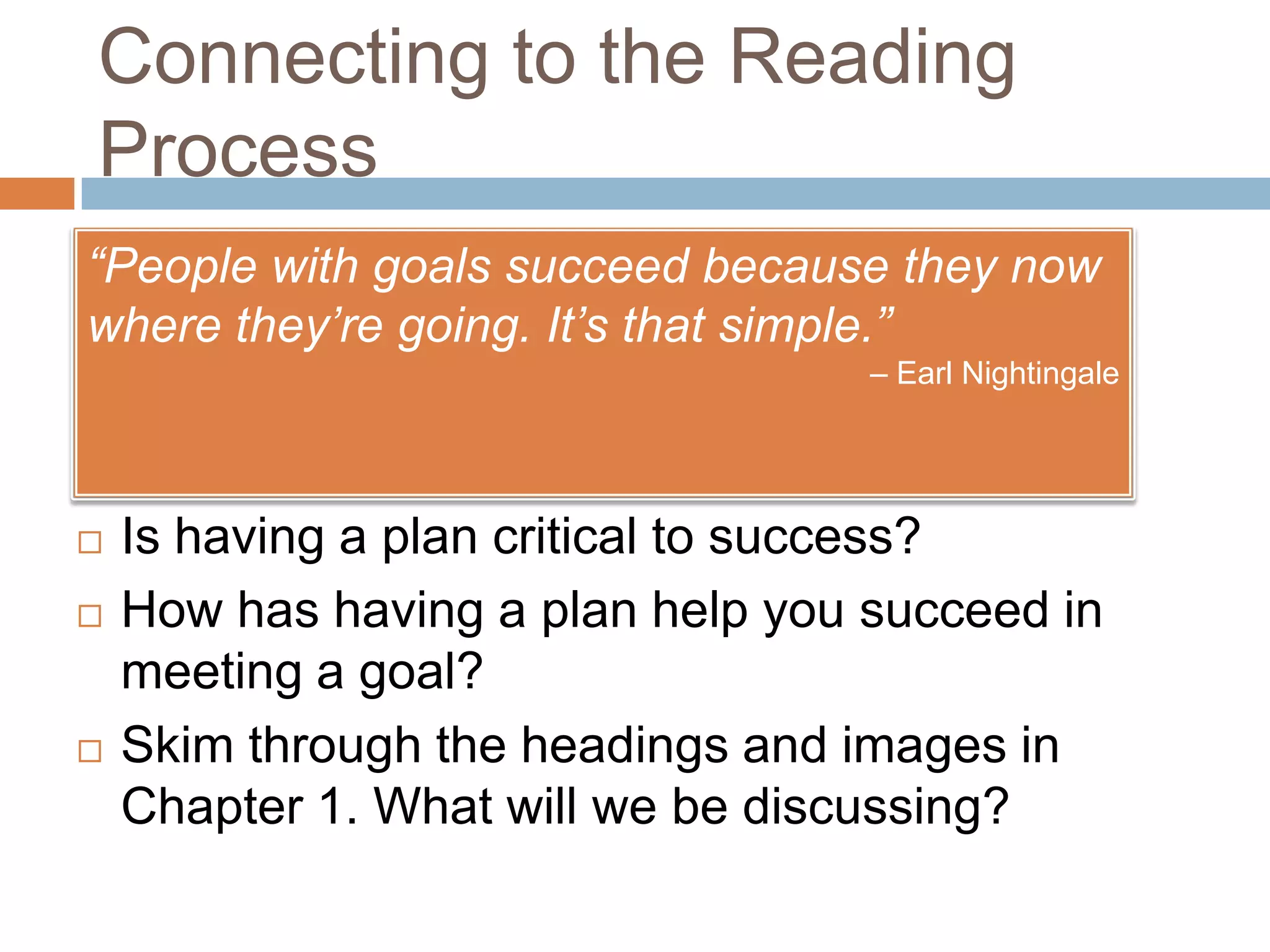Chapter 1 explores the reading process, emphasizing the importance of motivation and having clear goals for academic and career success. It discusses strategies to enhance reading comprehension, such as interacting with texts before, during, and after reading, and highlights the role of visualization and prior knowledge. The chapter concludes with activities to connect students' future aspirations to their reading practices and sets assignments for further engagement.