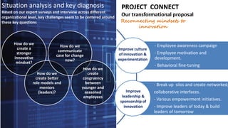 This document proposes a project called "Project Connect" to transform an organization's culture to become more innovative. It involves: