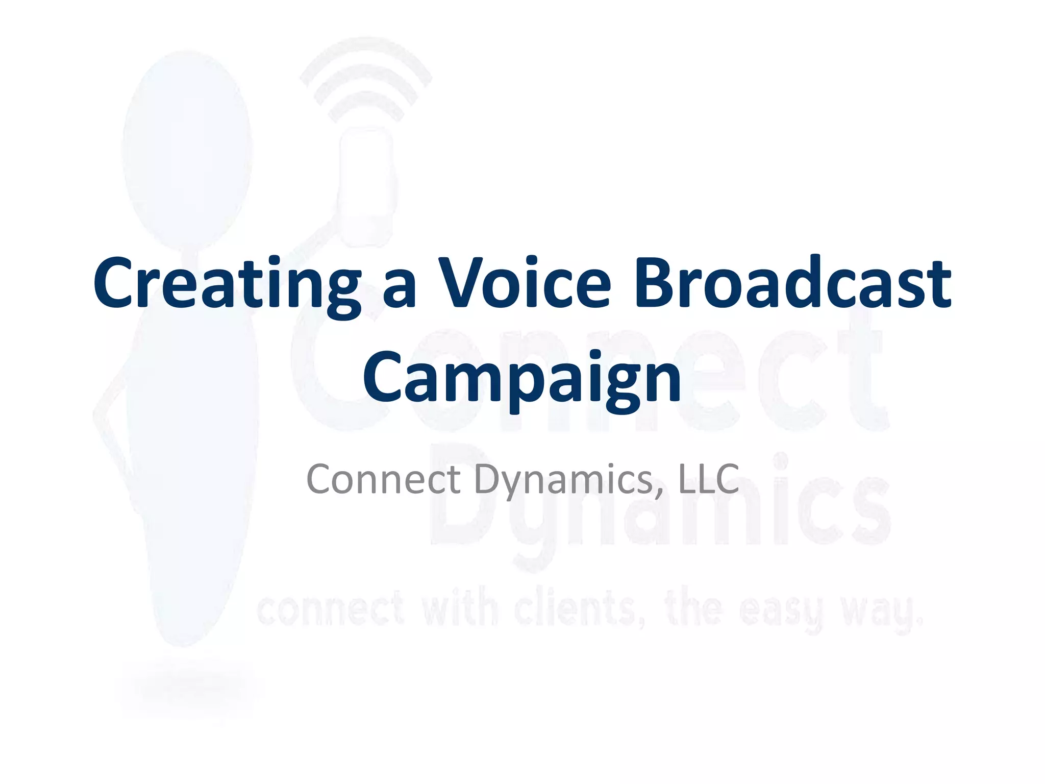 The document provides instructions for setting up a voice broadcast campaign using Connect Dynamics. It outlines the essential steps: 1) uploading pre-recorded messages or recording messages in the system, 2) preparing and uploading a phone list in CSV format, 3) obtaining a SAN number for compliance, 4) adding funds to the account, 5) creating and naming the campaign, 6) assigning sounds to the campaign, 7) testing a call, 8) uploading the phone list while scrubbing for Do Not Call compliance, and 9) running or scheduling the campaign.