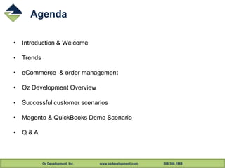 This document discusses how Oz Development integrates eCommerce channels into warehouse and fulfillment operations. It outlines trends in eCommerce growth and the need for order management systems. Oz Development's solution, OzLINK, is presented as integrating eCommerce platforms, warehouses, shipping systems, and ERPs to automate order processing. Examples are given of OzLINK integrating Magento and QuickBooks and Groupon with UPS WorldShip. The presentation concludes with an eCommerce checklist and a Q&A.