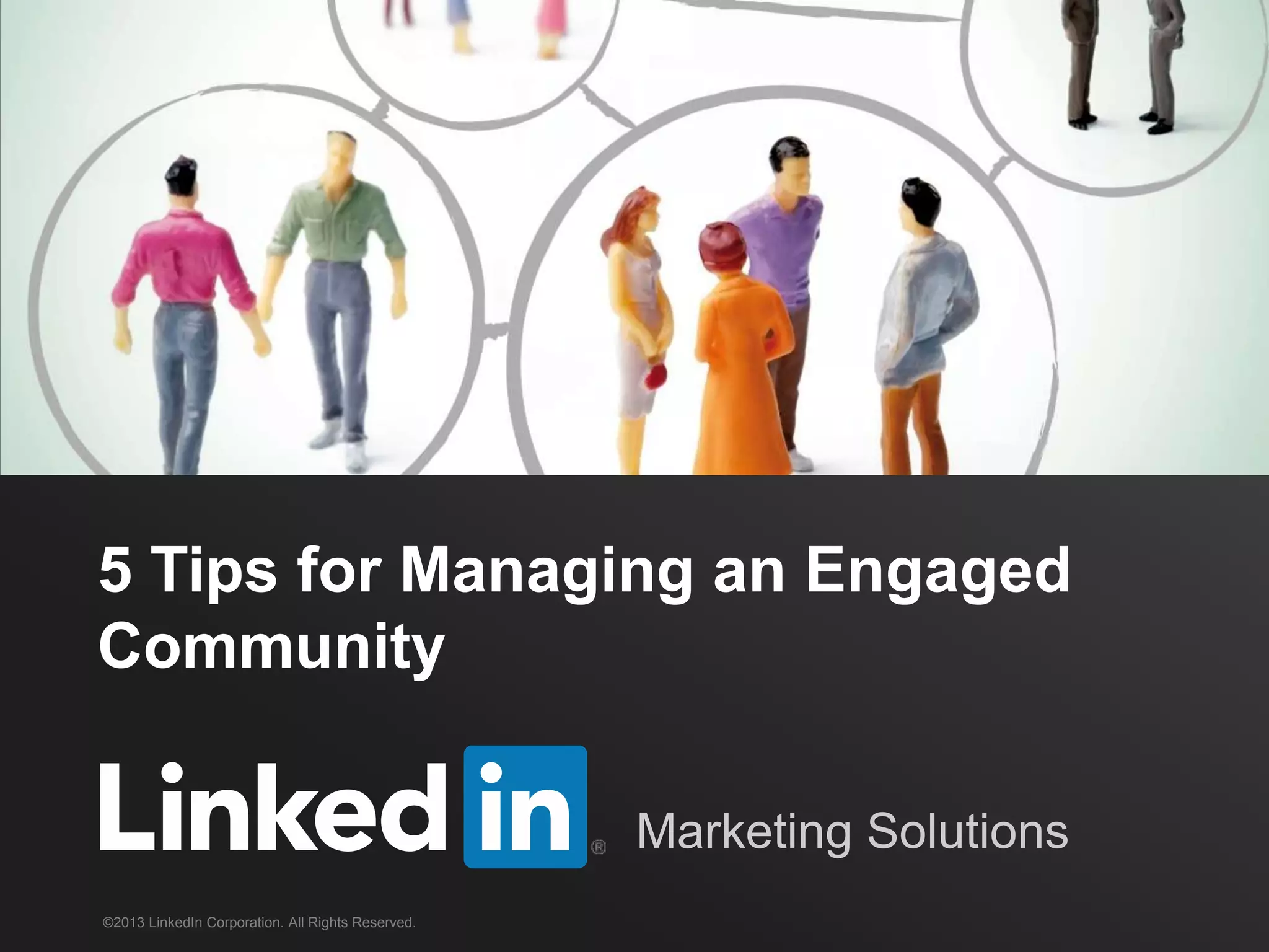 The document provides five tips for managing an engaged community: empower members, keep content relevant, have a flexible plan, bring in experts, and highlight group activity. These strategies are aimed at promoting active participation and meaningful contributions among community members. Additionally, it encourages the recognition of contributions to foster engagement and connection within the community.