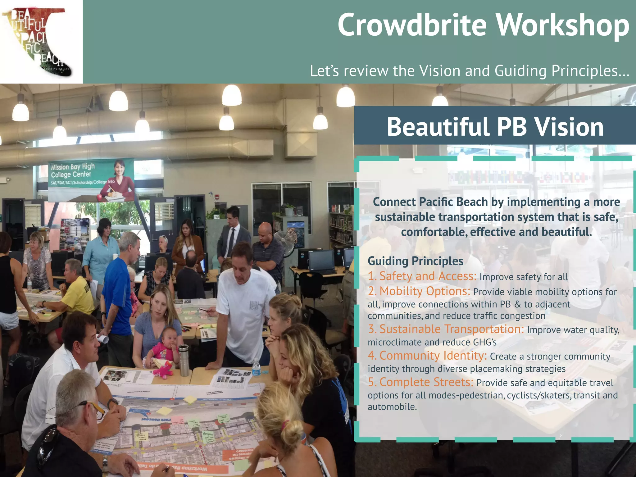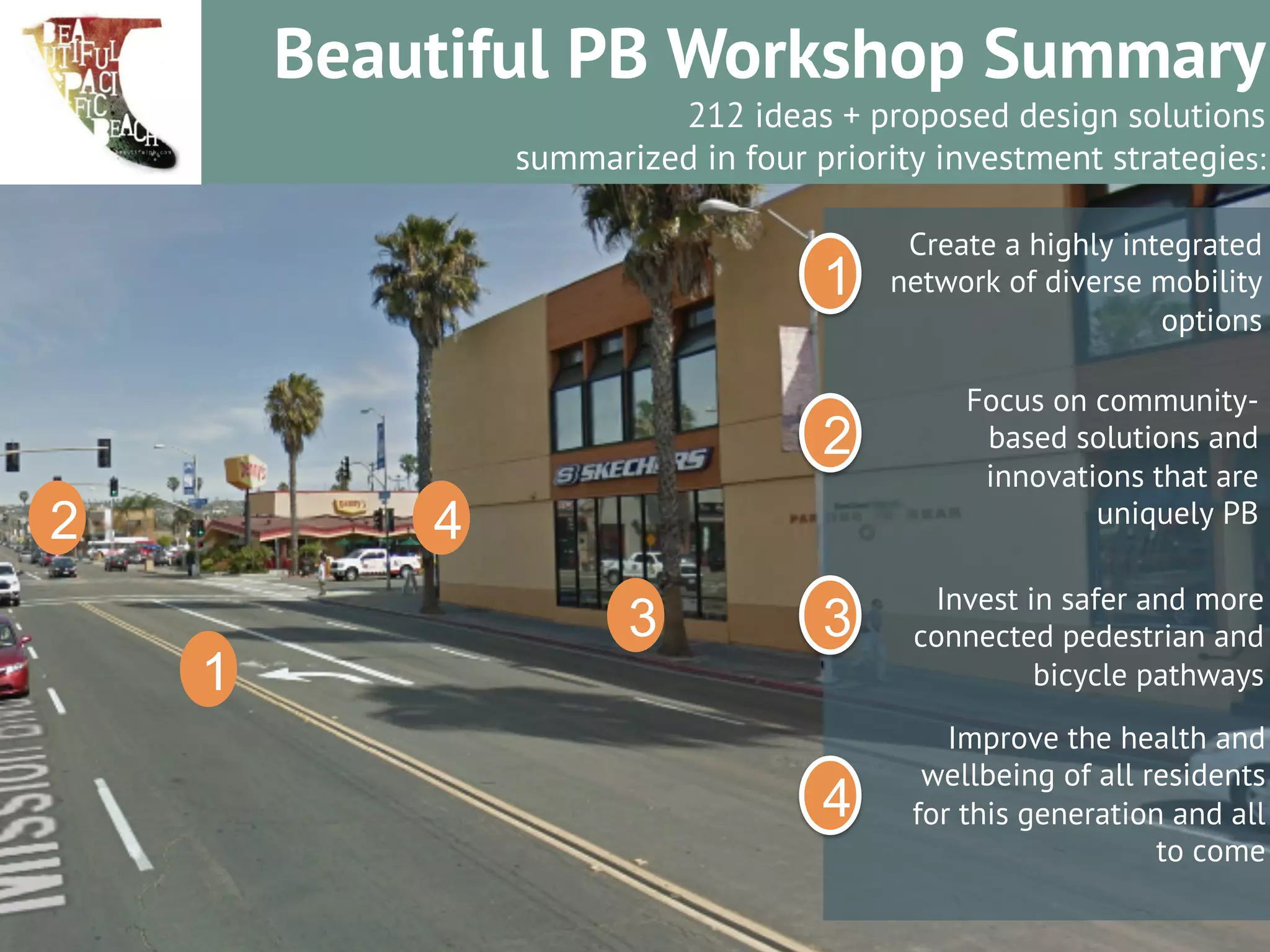 The document summarizes a workshop on improving transportation in Pacific Beach through crowdsourcing ideas. 212 ideas were proposed and organized into 4 priority investment strategies: creating an integrated mobility network; focusing on community-based solutions; investing in pedestrian and bicycle pathways; and improving resident health. The strategies and examples of ideas within each strategy are listed.