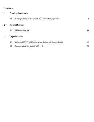 The document is a comprehensive guide for using the PowerGadgets creator, focusing on creating and managing dashboards. It includes tutorials on adding gadgets, configuring parameters, troubleshooting common issues, and upgrade guides for ConnectSmart. Key topics also cover error resolutions related to licensing, connection problems, and the step-by-step process for upgrading to newer versions.