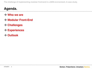 The document outlines a case study on the implementation of a modular front-end in an Adobe Experience Manager (AEM) environment by Namics, a leading Swiss internet consultancy. It details the benefits of using modular design, such as cleaner code and reusability, while also discussing challenges faced and various integration approaches. The presentation culminates in insights into future possibilities with AEM, specifically utilizing Sightly for valid HTML rendering.