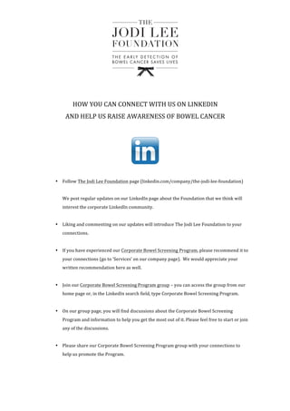 The document outlines ways to engage with the Jodi Lee Foundation on LinkedIn to raise awareness about bowel cancer. It encourages following their page, interacting with updates, and recommending their corporate bowel screening program to connections. Additionally, it invites users to join discussions in their corporate bowel screening program group to promote awareness and participation.