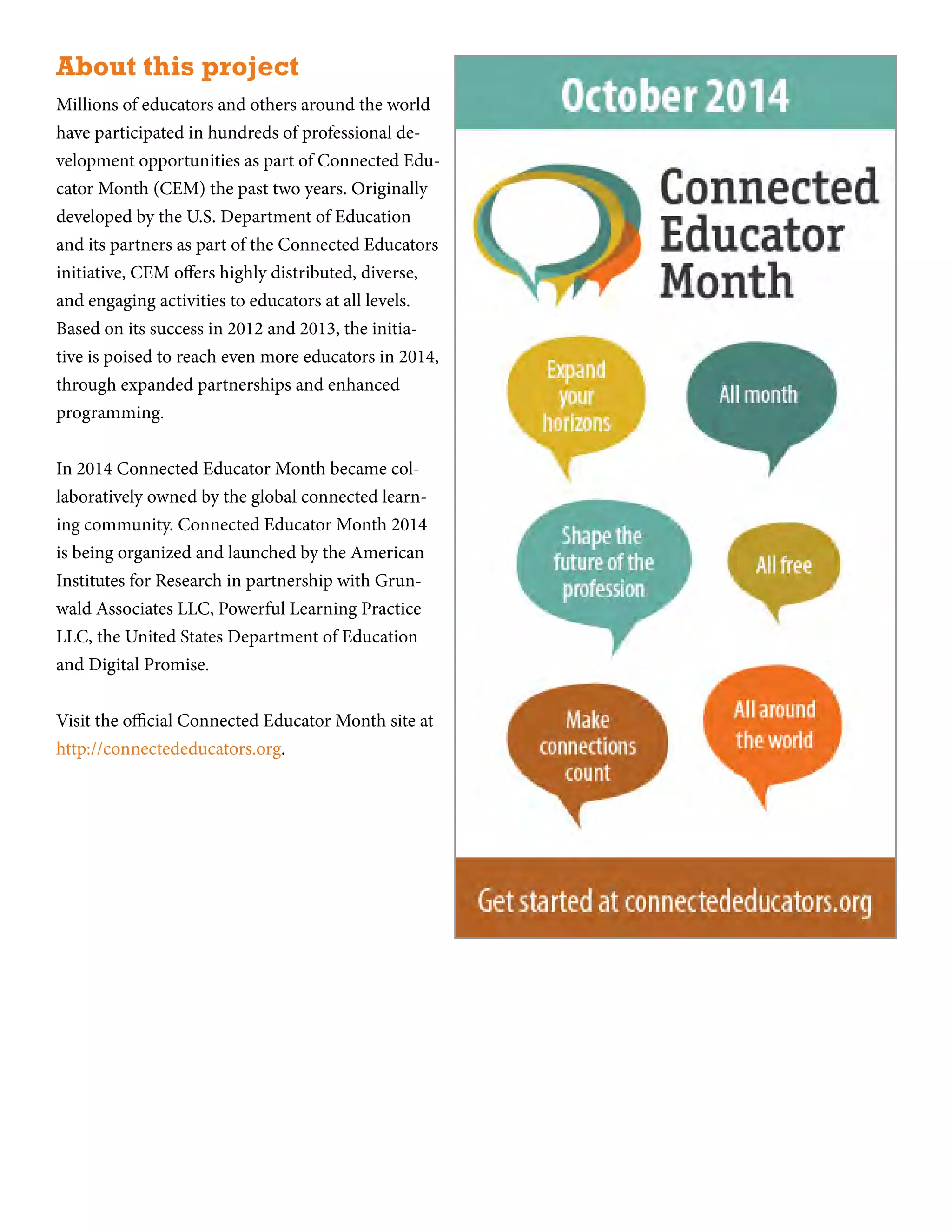 This document provides information about Connected Educator Month (CEM), including a starter kit to help educators get involved. CEM is a month-long initiative that offers professional development opportunities for educators through online events and activities. The starter kit guides educators through 31 days of activities focused on digital tools and online learning. It provides introductions to topics like Twitter, hashtags, blogs, and more to help educators engage with online professional learning networks.