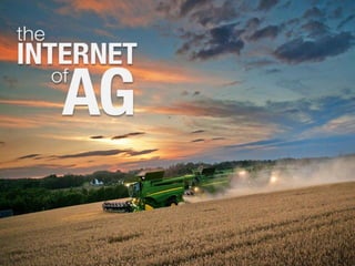 Connected farming utilizes sensors and the cloud to connect various machines and aspects of farming operations. Sensors in tractors and other equipment provide real-time data on factors like field moisture levels and machine locations that is uploaded to the cloud. This cloud connectivity allows for coordination between different machines, such as a planter being notified of a tractor's estimated time of arrival to a field, as well as generation of insights from aggregated farm data to optimize operations. For connectivity to provide value, a company needs to consider how to generate more useful insights than competitors from the same connected systems and data.