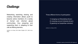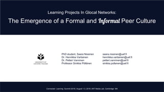 This document outlines a study by Saara Nissinen and colleagues on the co-creation of an international learning ecosystem involving students from the U.S. and Finland, focusing on shared inquiry into environmental topics. It discusses three types of participation in connected learning—hanging out, messing around, and geeking out—and presents principles for creating effective learning ecosystems. The study aims to enhance community engagement and utilize technology to facilitate learning through collaboration and inquiry.