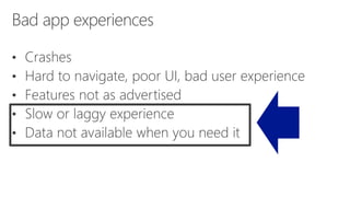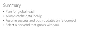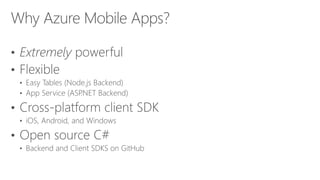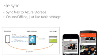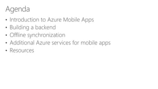 This document discusses how to build connected mobile apps using Microsoft Azure. It provides an overview of Azure services for mobile backends such as REST APIs, offline sync, push notifications, and authentication. It also provides code samples for creating a mobile backend, defining and syncing tables, and querying local data. The document promotes Xamarin for building native and cross-platform mobile apps with shared C# code and recommends resources for getting started with Xamarin on Azure.