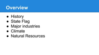 Connecticut was one of the original 13 colonies, founded by Thomas Hooker in the 17th century. It has a humid continental climate and economy based around industries like insurance, finance, advanced manufacturing, and tourism. Some of Connecticut's famous attractions include Mystic Seaport and Mystic Aquarium, as well as cities like New Haven and cities along the coast.