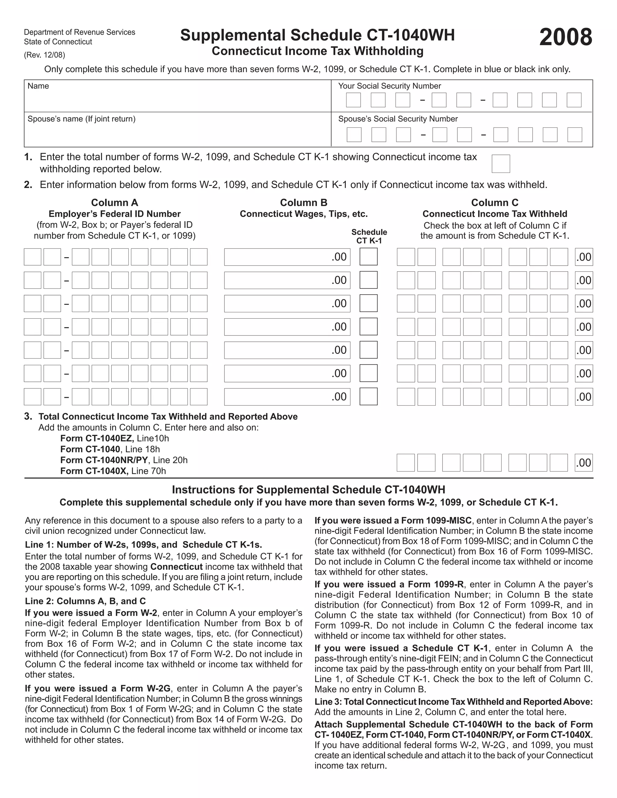 This document is the Connecticut Supplemental Schedule CT-1040WH for reporting Connecticut income tax withholding from more than seven W-2, 1099, or Schedule CT K-1 forms. It instructs filers to enter identifying information from each form in Columns A, B, and C, including employer ID numbers, income amounts, and withholding amounts. Filers are directed to total the Column C withholding amounts and carry that total to their Connecticut income tax return. The schedule is to be attached to Form CT-1040EZ, CT-1040, CT-1040NR/PY, or CT-1040X if more than seven withholding forms are being reported.