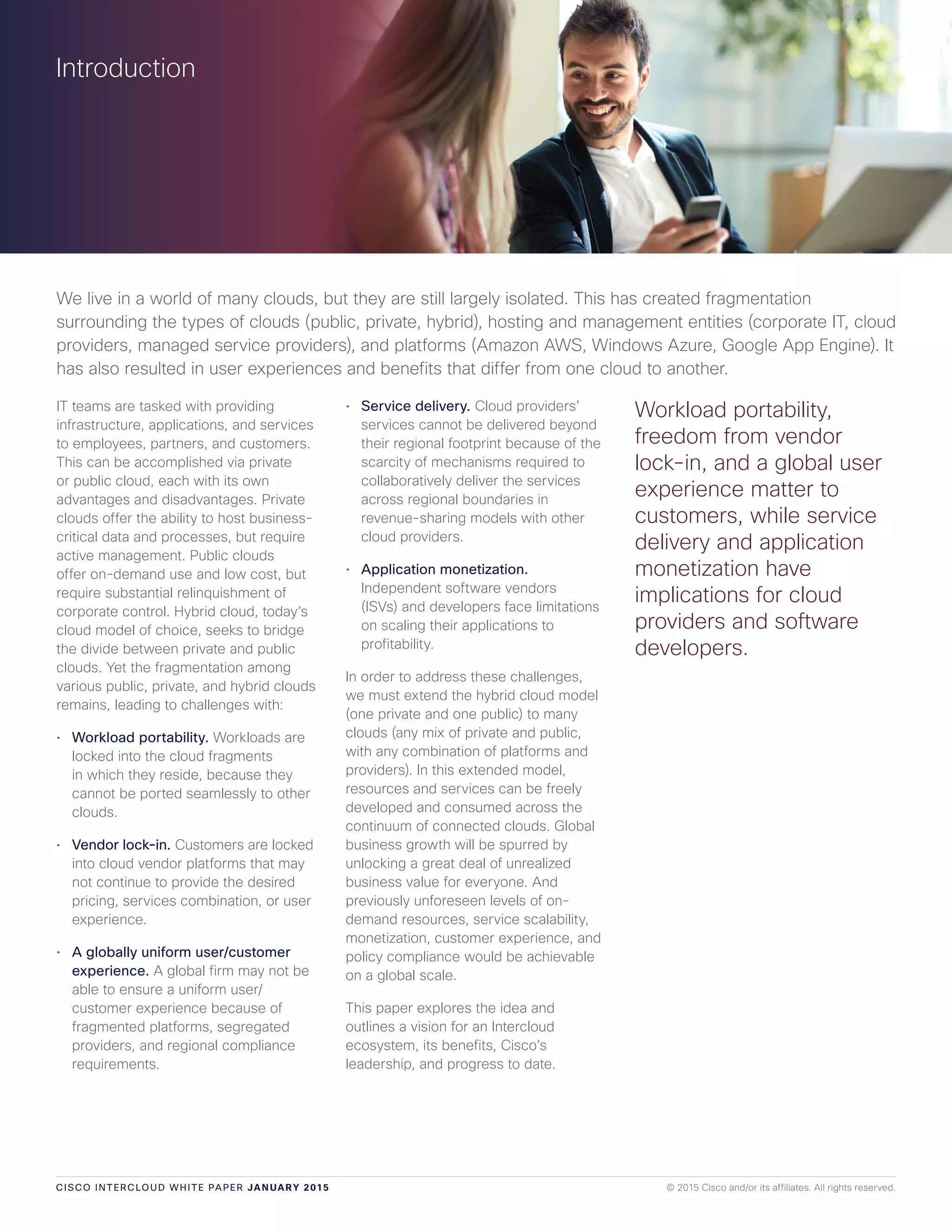 The Cisco Intercloud white paper outlines a vision for an interconnected cloud ecosystem that enhances hybrid cloud capabilities by addressing challenges such as workload portability, vendor lock-in, and global user experience. It emphasizes collaboration among technology providers, cloud providers, independent software vendors (ISVs), and developers to deliver scalable, compliant, and profitable cloud solutions. Cisco aims to unlock significant business value through this ecosystem, enabling organizations to access a diverse array of reliable services and applications while fostering global growth.