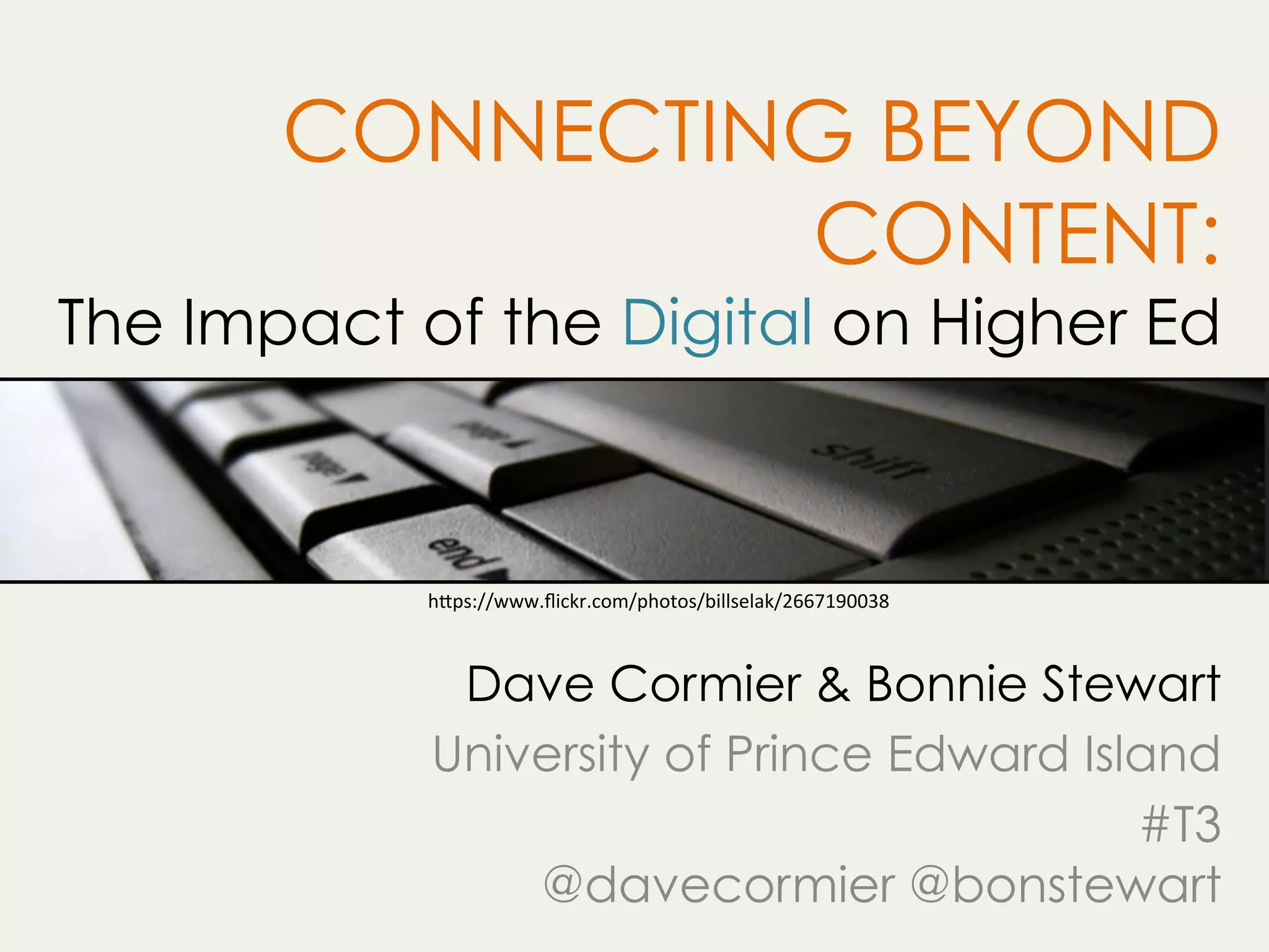 The document discusses how digital technologies are impacting higher education. It explores how education narratives have shifted from knowledge scarcity to abundance due to things like online content and networks. It emphasizes that educators need to help learners become "residents" who are productive participants in networked environments rather than just "visitors" who consume content. It outlines how this involves focusing on presence, encouraging independence through community-based learning, and supporting the development of networked identities. The goal is for learning to occur through open-ended connections in online spaces rather than being limited to formal instruction and assessment of objectives.