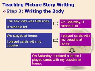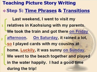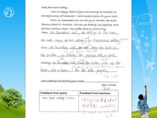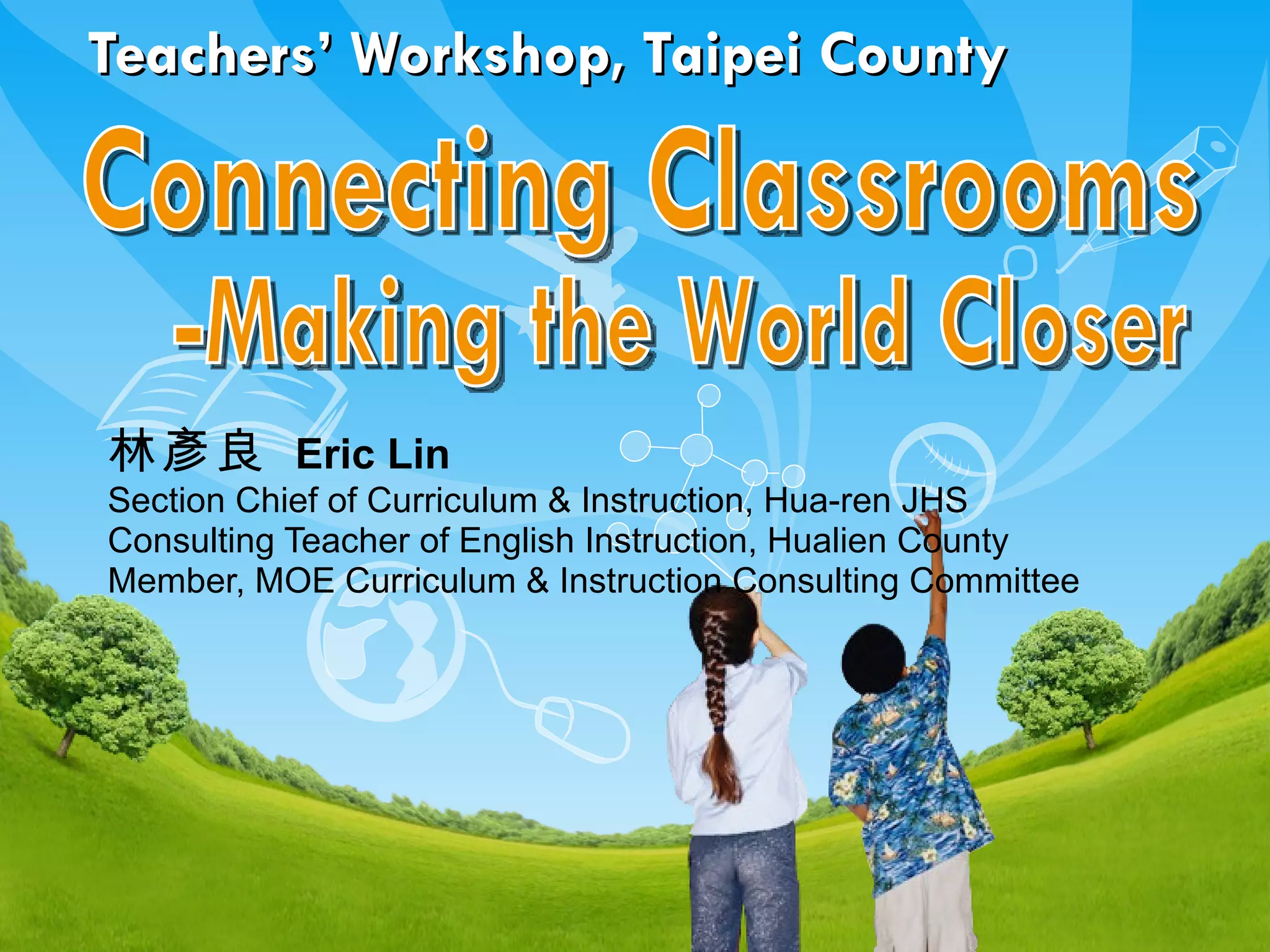The document discusses Connecting Classrooms, an international education program that partners schools in Taiwan with schools in other countries. It provides details about the program's goals of enhancing students' English skills, broadening their international perspectives, and preparing them for a globalized world. It then describes one school's experience participating in the program, including activities where students learned about each other's cultures through guided writing lessons on topics like traditions and tourism.