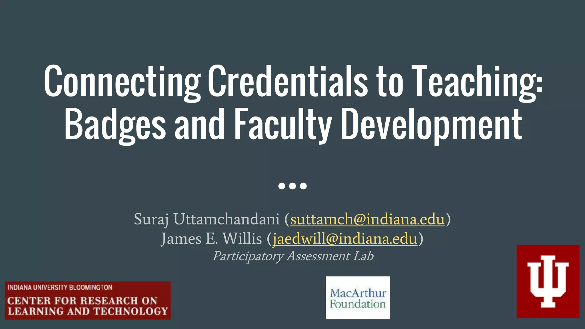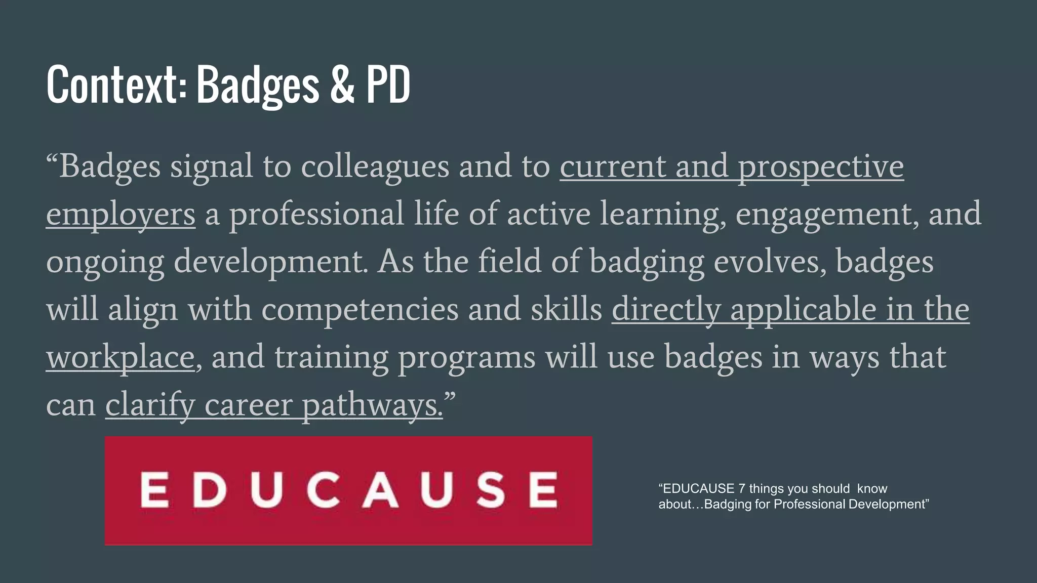 The document discusses the role of digital badges in faculty development and their potential benefits in signaling ongoing learning and professional engagement. Various examples from different universities illustrate how badges can be integrated with teaching workshops and can support faculty pathways, though there are challenges in their uptake and clarity of value. Recommendations for future progress include establishing best practices, providing greater university support, and clarifying the benefits of badge participation.