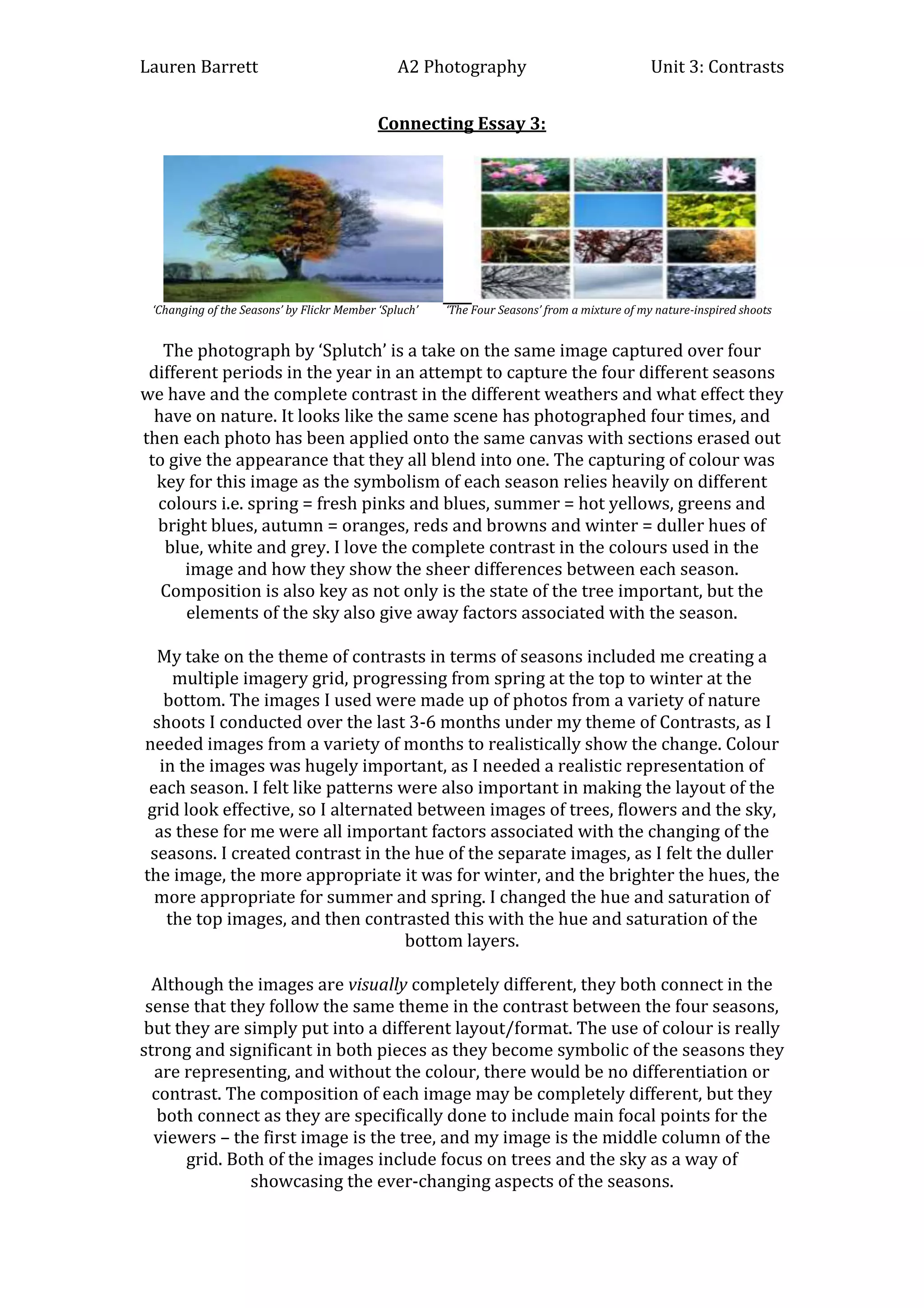 The student created their own piece depicting seasonal contrasts using a grid of nature photos taken over several months, with brighter colors at the top representing spring and summer and duller colors at the bottom for winter. Both works focus on trees and skies to showcase how nature changes with the seasons through differences in color, composition and focal points.