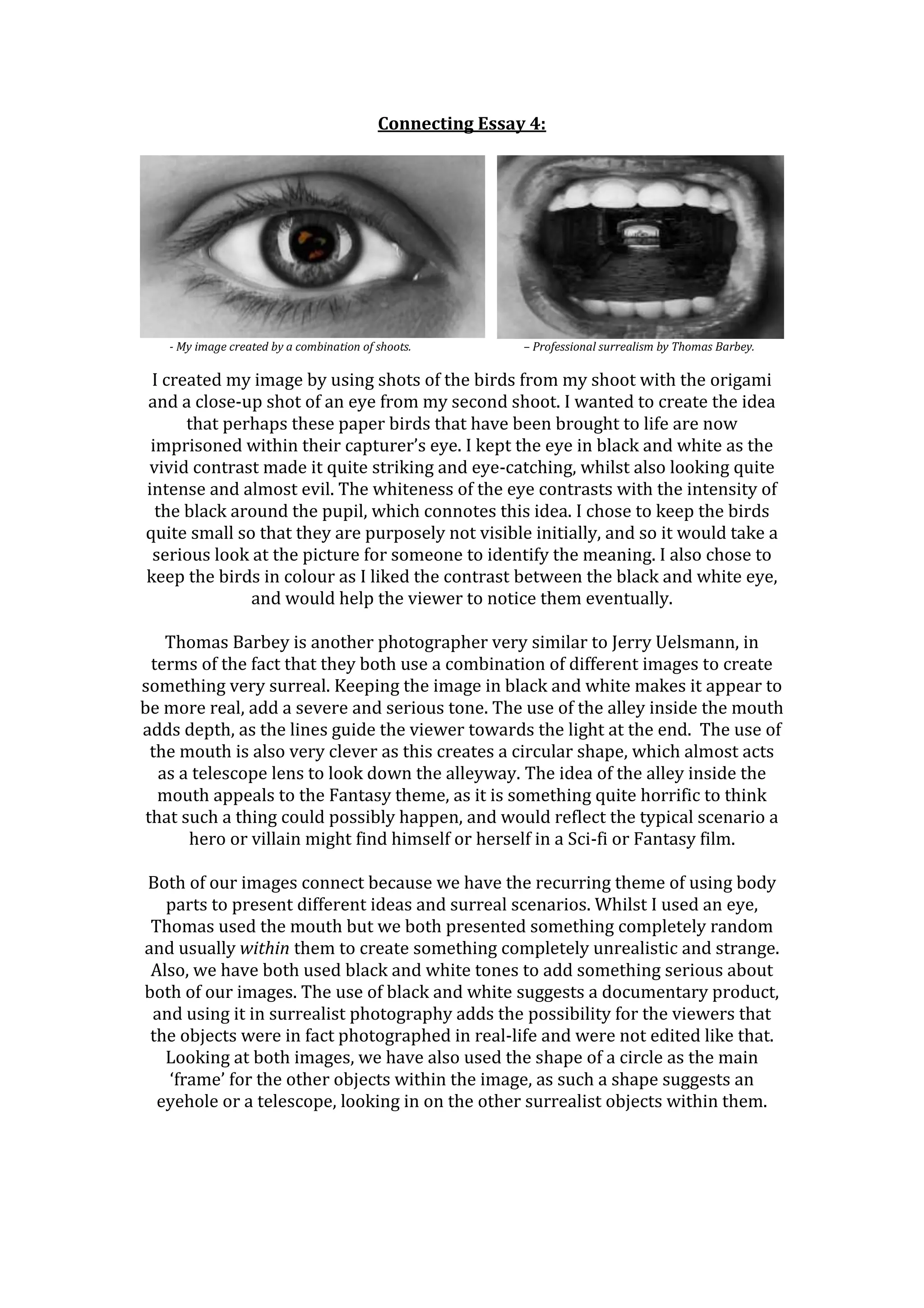 Thomas Barbey is a photographer like Jerry Uelsmann who combines different images to create surreal works. Barbey's black and white photo of an alley inside a mouth adds depth and a serious tone, with the mouth forming a circular frame. Both the author and Barbey present surreal scenarios using body parts and black and white tones, connecting their works through