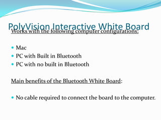 The document provides instructions for connecting an RM Classboard Touch interactive whiteboard to a computer via Bluetooth. It discusses downloading the necessary PolyVision software and drivers. For PCs, it describes setting the Bluetooth service to start automatically and pairing the computer to the IWB's Bluetooth adapter by entering a passcode. Once configured, the computer should automatically connect to the IWB on startup. The document also outlines calibrating the IWB screen.