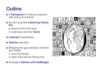 The document discusses connecting research, policy, and practice in e-learning. It provides a framework linking the four areas of research, policy, teacher practice, and learner experience. It then examines the history of e-learning and various technologies and pedagogical approaches. Key lessons include the need for new digital literacies and better linking research to policy and practice. The future will involve an ongoing evolution of technologies and their use in education.