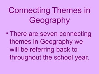There are seven connecting themes in geography that will be referred back to throughout the school year: conflict and change, culture, governance, human environmental interaction, location, movement and migration, and production, distribution, and consumption. These themes explore how societies are shaped by conflicts, cultures, forms of government, relationships with the environment, locations, movements of people, and economic activities. Students will document these connecting themes in their interactive notebooks for use during the entire school year.