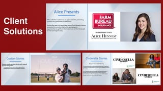 The document outlines various client solutions offered, focusing on creative content across multiple platforms including video, social media, and live streaming. It highlights the effectiveness of their strategies in engaging audiences and providing tailored solutions for partners. Additionally, it emphasizes the success of specific campaigns and programming, showcasing community appreciation and industry standards.