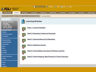 This document summarizes the evolution of online faculty training and certification programs at Alabama State University. It discusses how the initial in-person certification course was expanded to include more pedagogy and accommodate more faculty. Over time, the course was transitioned to a hybrid then fully online format. Additionally, a separate certification program was developed for academic administrators to help them better evaluate online instruction. The document outlines the rationale, structure and goals of the certification programs for both faculty and administrators.
