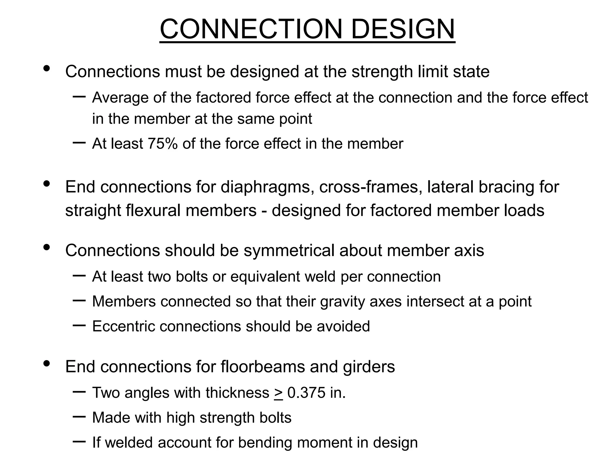 3) Proper bolt pretension, hole size, edge and end distances must be considered for bolted connection design according to specifications. Welded connections require quality control due to potential subsurface defects.