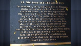 Old Town is a historic neighborhood in Chicago located between Lincoln Park and downtown. It has a diverse population and is home to many attractions like St. Michael's Church, one of the few buildings that survived the Great Chicago Fire of 1871. The neighborhood can be accessed via the Red Line train or a 40 minute ride from Loyola station. Wells Street is the main commercial area with many restaurants and shops. Important sights include the Chicago History Museum which has exhibits on the city's history. Exploring Old Town with friends provided an authentic experience of Chicago's diverse history and culture.